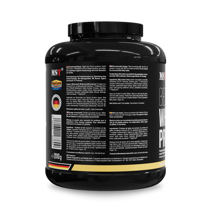 Откройте для себя непревзойденный протеиновый опыт с MST® BEST Whey Protein Banana Yougurt 2010 г, дополненным DigeZyme® - освежающей комбинацией, которая обеспечивает ваш организм высококачественным белком и пищеварительными ферментами.